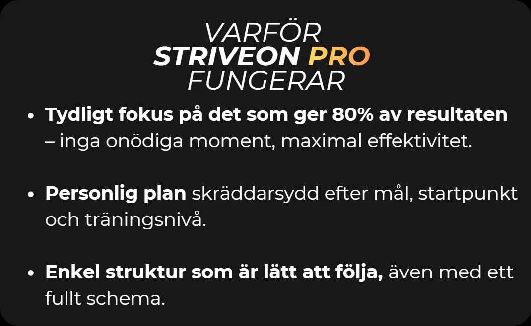 När du köper StriveOn Pro får du direkt tillgång till hela Pro-kursen och Bas-kursen via ditt kundkonto. Där hittar du alla moduler, 80/20-guider, resurser och bonusmaterial.
